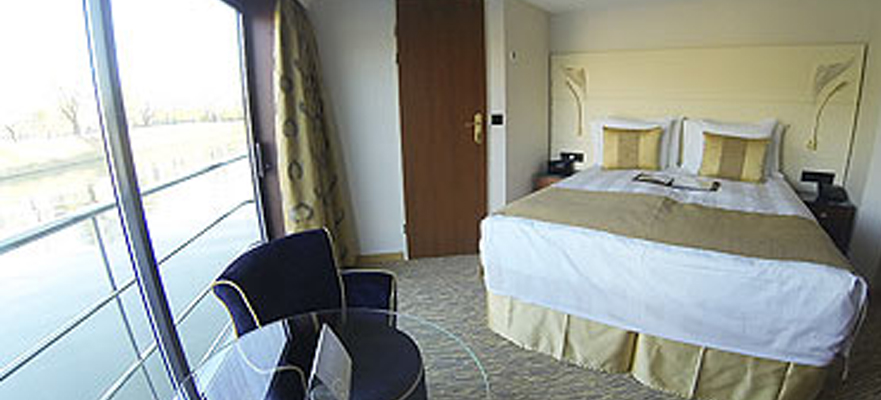 The gracious aft lounge in the stern of your riverboat sports an innovative 180° curved glass wall that opens to the fresh air (weather permitting).