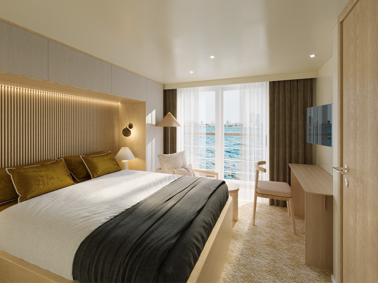 The Horizon Suite is an elegantly designed suite with a large wardrobe and the choice between twin or king bedding. Its most striking feature is the floor-to-ceiling glass doors that open onto a private balcony, offering a panoramic view. The suite includes a spacious bathroom with a shower, heated floors, luxury amenities, and a hairdryer. There’s individually-controlled air conditioning and international 240V sockets, USB charging points, and wall-mounted reading lamps are provided. Entertainment needs are catered for with a flat-screen TV and an on-demand entertainment system. Guests also enjoy complimentary and unlimited Wi-Fi, though connectivity may vary depending on navigation and latitude.